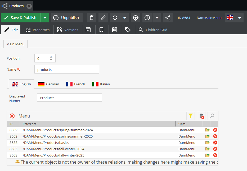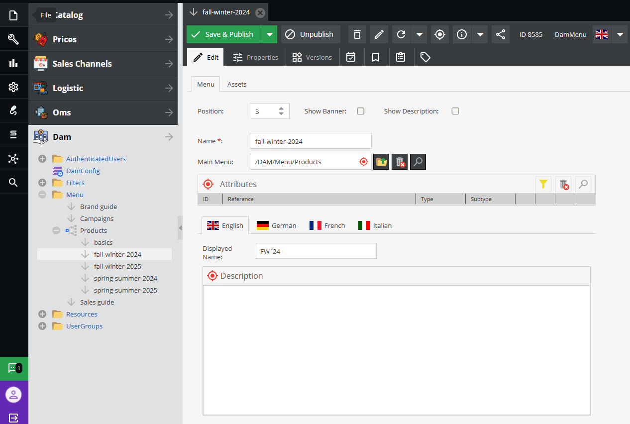 - Displayed Name: nome in lingua della sottocategoria. È il nome visibile sul DAM;