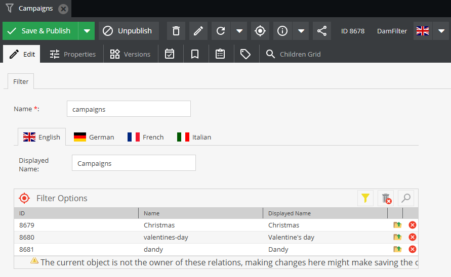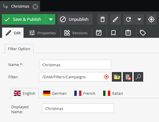 - Displayed Name: il nome visibile nell’interfaccia del DAM (impostabile per lingua);