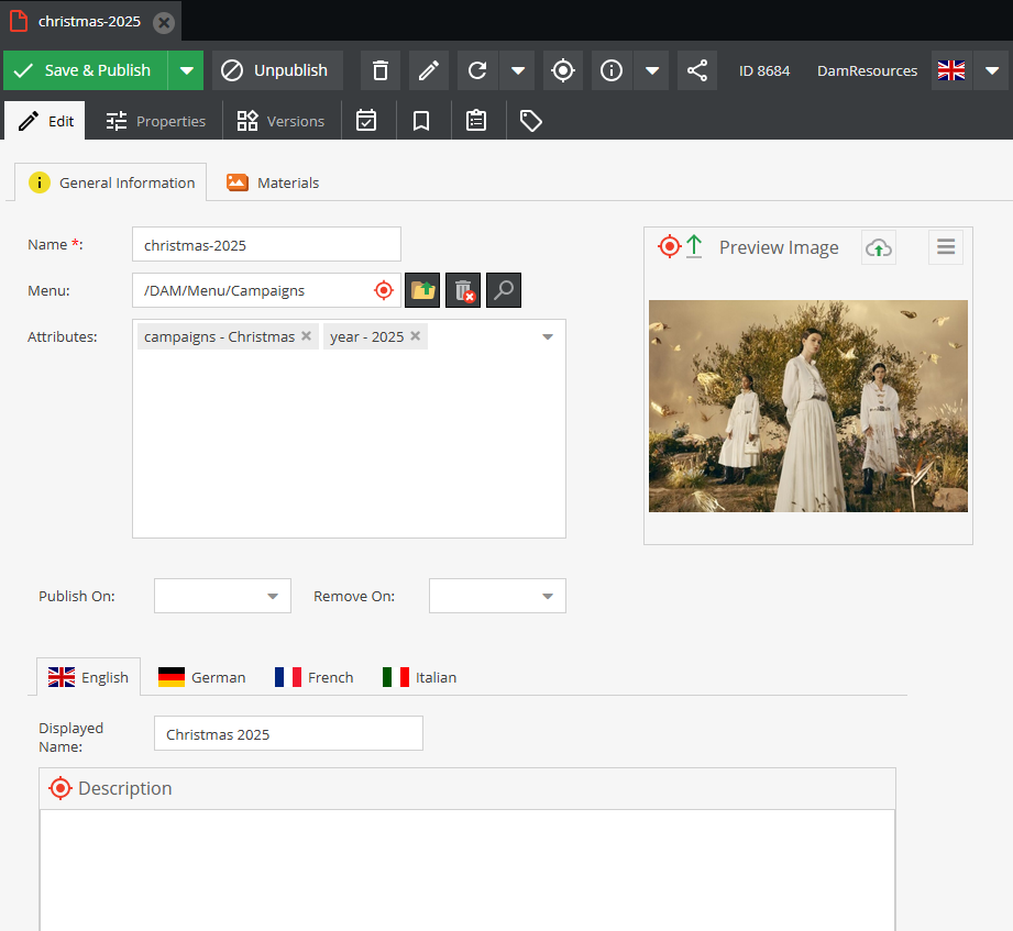 - Publish On: data dalla quale rendere una risorsa visualizzabile sul DAM;