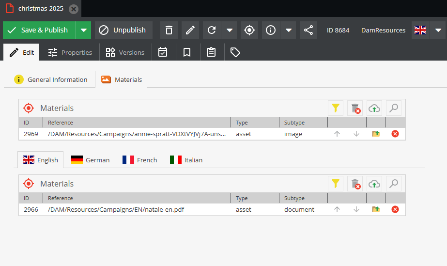 - Materials (campo base): lista di asset (immagini, pdf, video, etc..) non specifici per lingua;